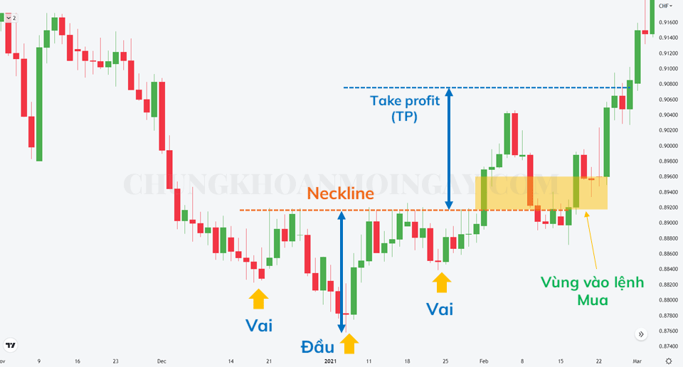 Đối với một mô hình giá Vai đầu Vai Ngược (tăng giá), Mua: