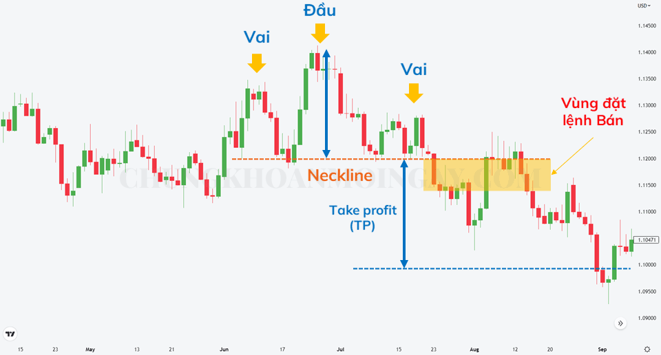Khối lượng giao dịch (Volume) khi thoát khỏi đường viền cổ tăng mạnh. Mục tiêu lợi nhuận tương đương với khoảng cách từ đường viền cổ áo và Đầu, khi đạt đến mức này chúng ta thoát lệnh.