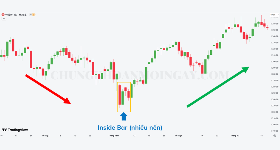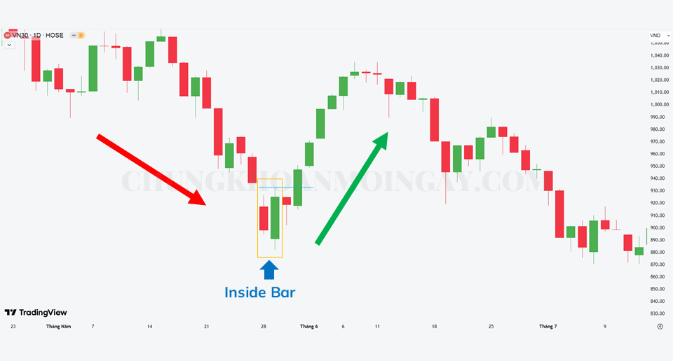 Với ví dụ biểu đồ chỉ số VN30 khung ngày (VN30, D1) bên dưới xuất hiện mô hình nến Inside Bar. Tuy nhiên, để cẩn thận chúng ta cần đợi xác nhận của một cây nến giảm phá vỡ điểm cao nhất của mô hình nến. Nếu đặt lệnh Mua (Long) thì chúng ta có thể đạt được một khoản lợi nhuận nhất định.