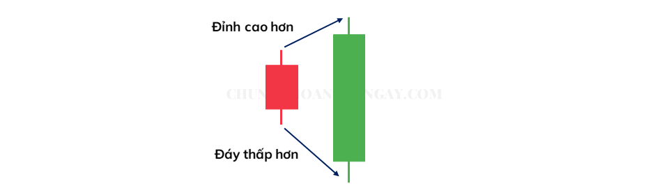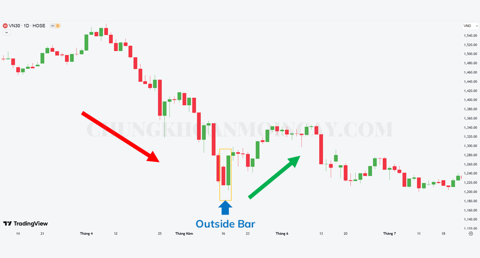 Một Outside Bar (OB) là hình ảnh ngược lại với Inside Bar (IB). Chiều dài của nó phải bao bọc toàn bộ cây nến liền trước nó, tức là phải có đỉnh cao hơn và đáy thấp hơn.