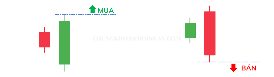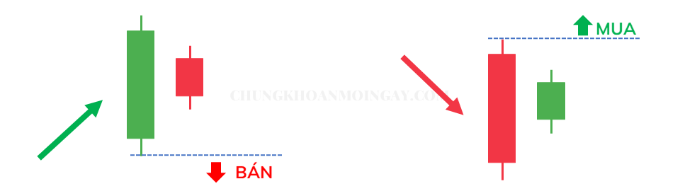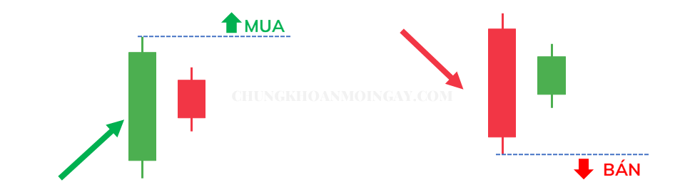 Nếu giao dịch xu hướng tiếp diễn (phổ biến hơn), ta đặt Buy Stop tại đỉnh Mother Bar trong xu hướng tăng, hoặc Sell Stop tại đáy Mother Bar trong xu hướng giảm.