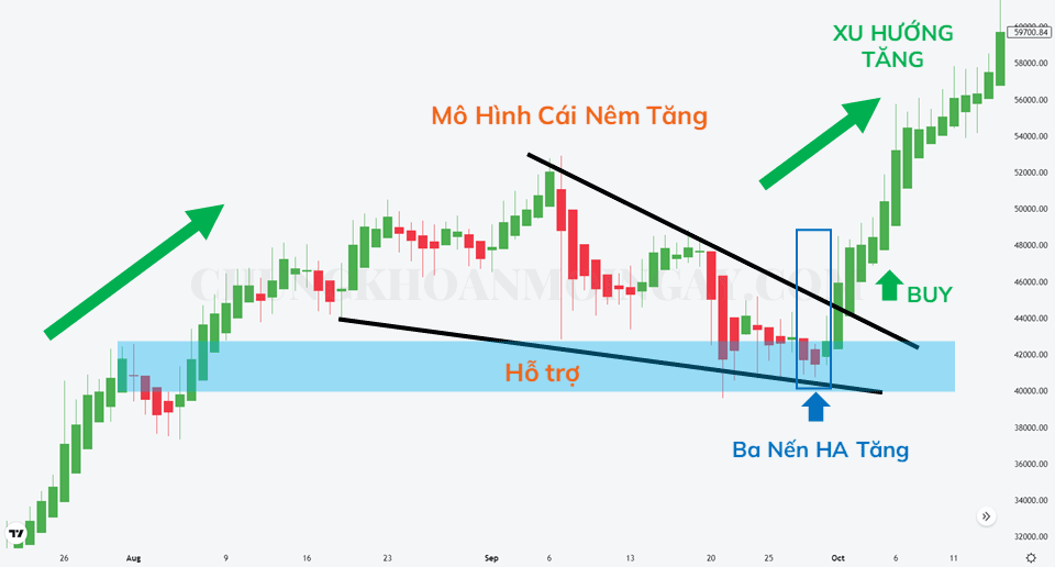 Vì thế chúng ta sẽ đặt lệnh Mua ngay tại vị trí giá phá qua mô hình cái Nêm. Điểm dừng lỗ (Stoploss) có thể đặt dưới vùng Hỗ Trợ (Support). Điểm chốt lời (Takeprofit) theo tỉ lệ thông thường R:R là 1:2 hoặc bằng chiều cao của Nêm.