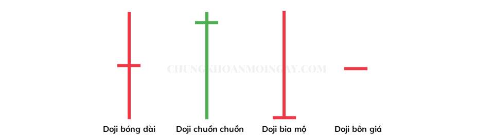 Có 4 loại nến Doji đặc biệt: dựa vào độ dài của bóng nến trên và dưới khác nhau.
