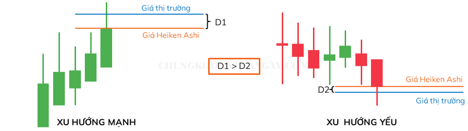 Khi một xu hướng phát triển, nến Heiken Ashi (HA) thực sự bắt đầu tạo đà cho nhau khi giá được đẩy lên cao hơn hoặc thấp hơn – sự chênh lệch giữa giá thị trường thực tế và giá HA sẽ mở rộng đáng kể.