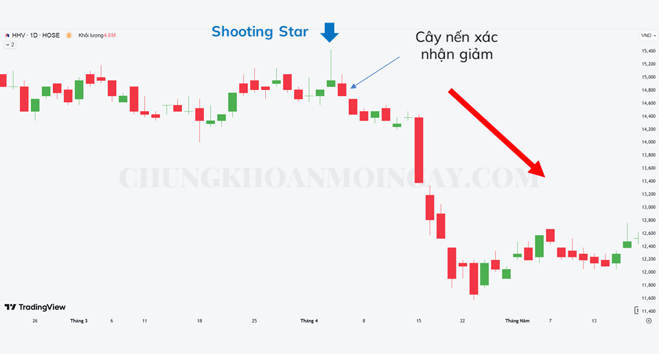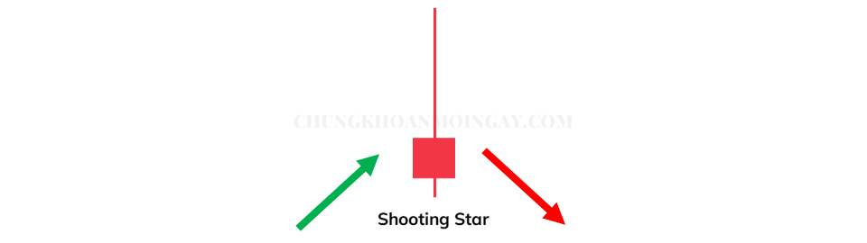 Mô hình nến Bắn sao – Ngôi Sao Băng (Shooting Star) là một mô hình đảo chiều giảm với cấu trúc giống như mô hình Búa Ngược nhưng nó xuất hiện khi giá đang tăng. Điều này cho thấy bên Bán đang bắt đầu thắng thế so với bên Mua trong xu hướng lên và giá có thể sẽ quay đầu giảm trở lại.