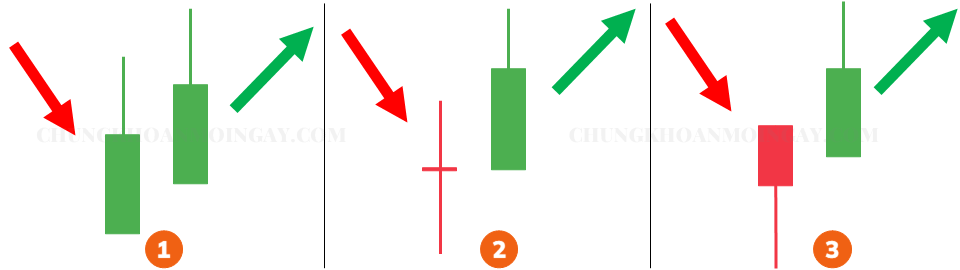 Dưới đây là những mô hình 2 nến Heiken Ashi đảo chiều tăng mà chúng ta thường thấy trên các biểu đồ giao dịch.