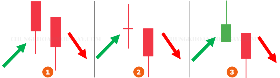 Tương tự, dưới đây là tổng hợp những mô hình 2 nến Heiken Ashi đảo chiều giảm thường thấy trong các biểu đồ giao dịch.