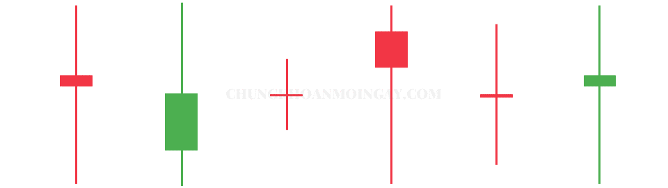 Dưới đây là những mẫu hình nến Heiken Ashi thường xuyên xuất hiện khi thị trương trong giai đoạn đi ngang (sideway). Đây là giai đoạn thị trường phân phối hoặc tích lũy.
